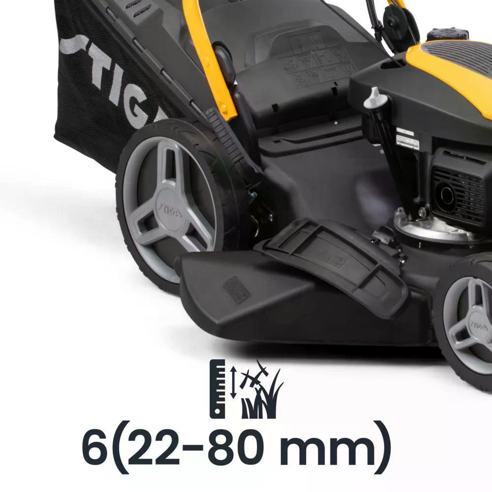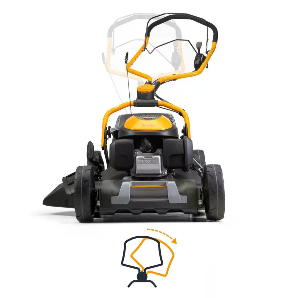 Het stalen chassis herbergt een betrouwbare 167 cc Honda GCVx170 benzinemotor, die garant staat voor geweldige prestaties en betrouwbaarheid. Met de snelheidsvariator kun je de snelheid van de maaier gemakkelijk regelen, zodat je hem kunt aanpassen aan je behoeften. De gecentraliseerde maaihoogte is eenvoudig met een hendel in te stellen op 6 verschillende standen, variërend van 22 tot 80 mm. Dankzij de grote achterwielen kun je gemakkelijk manoeuvreren op oneffen terrein. Zijdelingse deflector en mulchplug zijn inbegrepen.